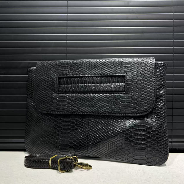 Elevate your style with the versatile DONT SHOOT THE MESSENGER HANDBAG in a black crocodile pattern. Designed to be worn as a messenger bag, clutch, or crossbody, it adapts effortlessly to your day-to-night needs. Crafted for fashion-forward individuals, this handbag combines practicality with a bold statement, making it the perfect accessory to complete any outfit.